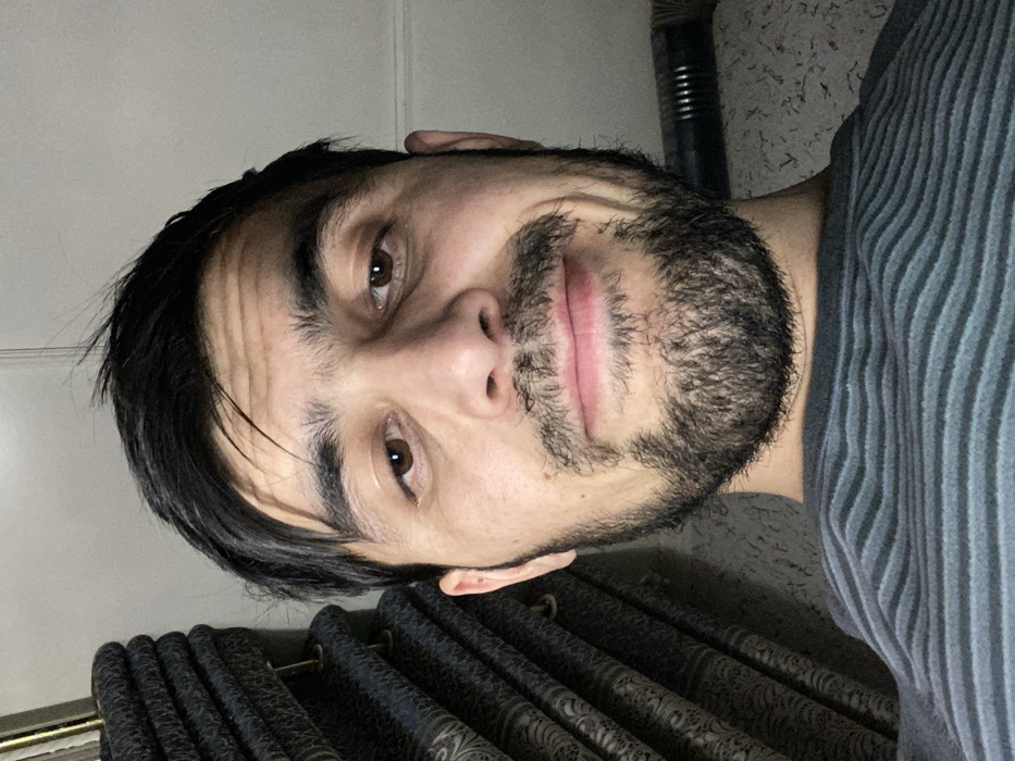 A person with dark hair and a beard looks directly at the camera. Their skin appears fair, and they have brown eyes. The person is wearing a gray striped shirt. Behind them, there is a curtain with a dark pattern and what looks like a ribbed metallic object. The image is rotated to the side.