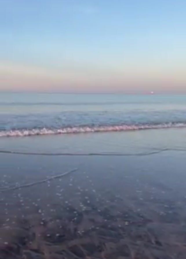 The video displays a beach at what appears to be sunrise or sunset