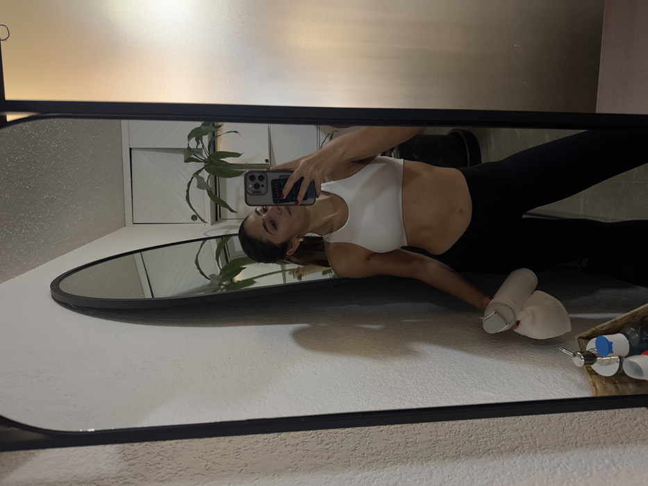 The image displays a female individual taking a mirror selfie in an indoor setting, appearing to be a residential or private space within Cuernavaca, Mexico. The subject, with dark hair pulled back, is clad in a white sports bra and black leggings, revealing her midriff. She holds a dark-colored smartphone, equipped with a multi-lens camera, in her right hand, positioning it to capture her reflection in the mirror. Her left hand holds a light-colored insulated bottle and a light-colored cap or small fabric item. Gold-colored hoop earrings are visible on her ears. The primary mirror is full-length, arched, and framed in black. A second, smaller, oval-shaped mirror with a black frame is partially visible behind the reflection of the subject. The environment reflected in the mirrors includes a textured light-colored wall and ceiling. Visible elements in the background are a large green leafy plant in a dark pot, white sliding cabinet doors or closet panels, and an air conditioning unit mounted high on the wall. To the right of the woman's reflection, a frosted glass panel or door with a black frame is present. In the lower left, a woven basket contains various toiletries, including a silver-topped dispenser bottle. The scene is illuminated by indoor artificial lighting.