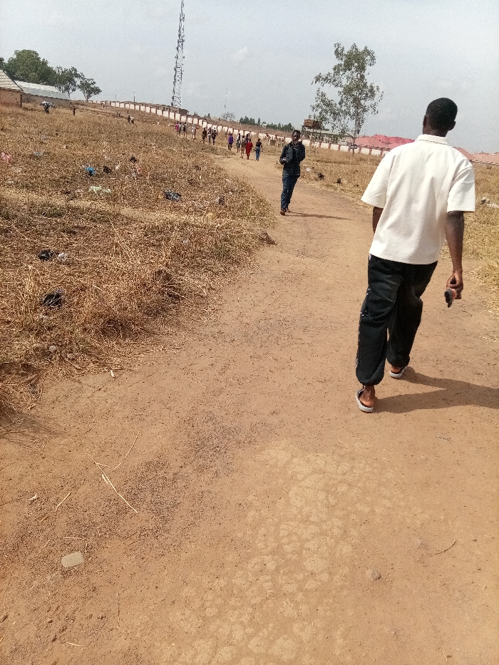 The image displays an unpaved reddish-brown dirt path in an open, semi-arid environment under a hazy sky, in an unknown city and country. In the foreground, an individual, male, is walking away from the camera, slightly to the right of the path's center. He wears a loose white short-sleeved shirt, dark cargo pants, and light-colored sandals, holding a dark object in his right hand. Approximately 10-15 meters ahead, another male individual walks towards the camera on the same path, wearing a dark jacket, dark pants, and sunglasses. To the left of the path, dry, golden-brown grasses and scrub are visible, interspersed with scattered litter, including plastic bags and dark fabric items. In the mid-ground, a group of approximately 10-15 people walks in a loose formation along a distant section of the path, bordered by a long, low, light-colored wall. Behind this wall, buildings with reddish roofs are visible, and a tall metal lattice communication tower stands prominently against the skyline on the left. A lone deciduous tree with sparse foliage is visible on the right side of the background.