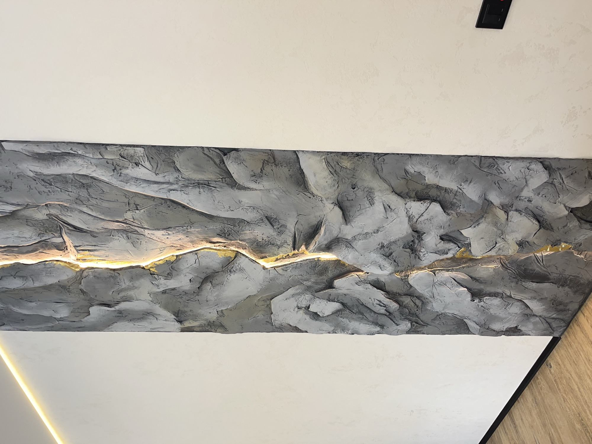 An interior scene in Новая Чернушка, Russia, displays a vertical, floor-to-ceiling decorative wall panel with a three-dimensional, dark and light gray textured relief resembling a natural rock formation. A prominent, jagged crevice runs vertically through the panel, illuminated from within by a continuous golden-yellow light source. The panel is bordered on the left and right by smooth, off-white walls featuring a subtle, granular texture. At the top left, a linear, warm white LED strip light is recessed into the ceiling-wall junction. The lower left quadrant shows light brown wooden flooring meeting the wall via a thin black baseboard. A black rectangular electrical switch is mounted on the off-white wall to the right. No human presence or activities are depicted.
