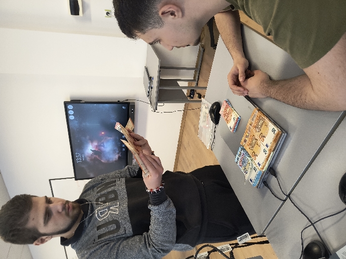 In an interior setting in Razgrad, Bulgaria, two young adult males are present in what appears to be an office or classroom