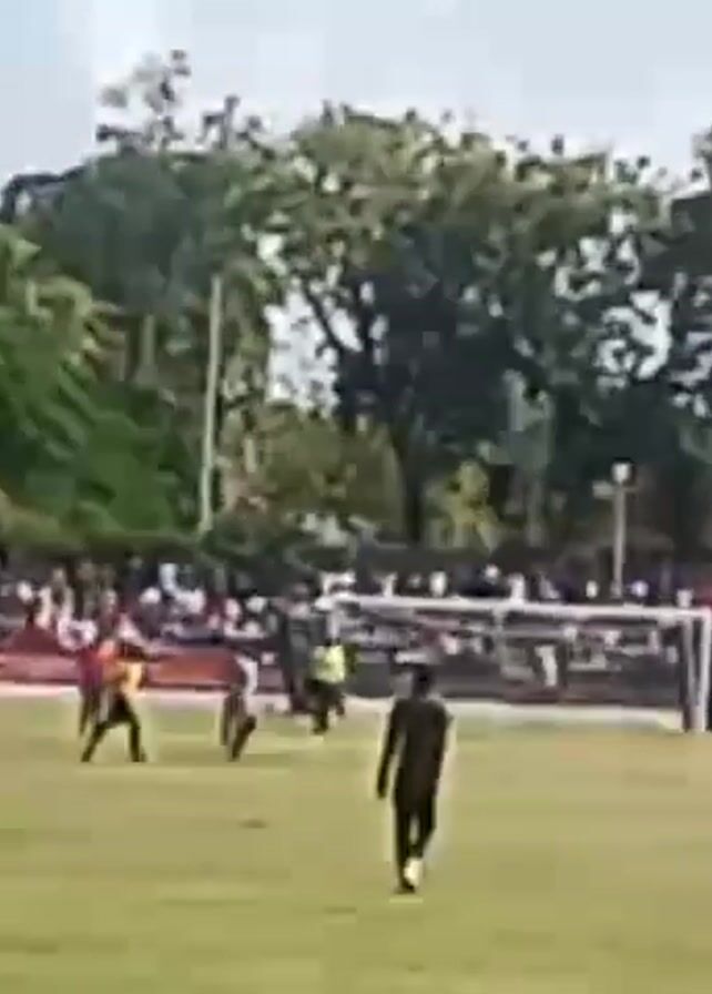 soccer game in progress on a green field, with two goals visible. Several players wearing different colored jerseys are running across the field. One player wearing black is standing in the foreground. Behind the field, a large crowd is seated in the stands. Trees and a cloudy sky are visible in the background.