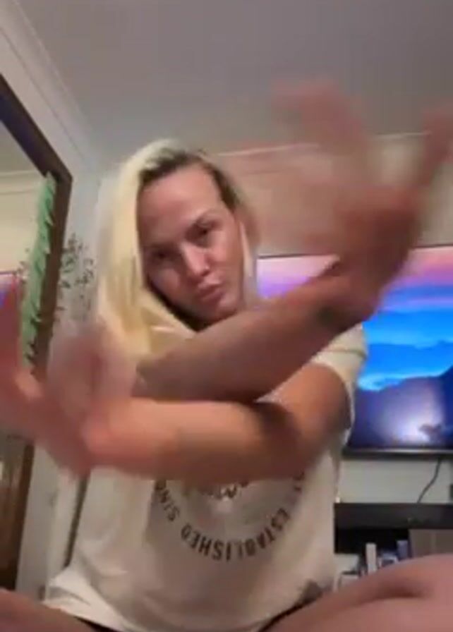 A blonde woman in a Tom Tailor T-shirt sits cross-legged in front of a TV. She reaches out with her hands toward the camera and then pulls them back, repeating the gesture a few times. There's a mirror and a second TV visible in the background.