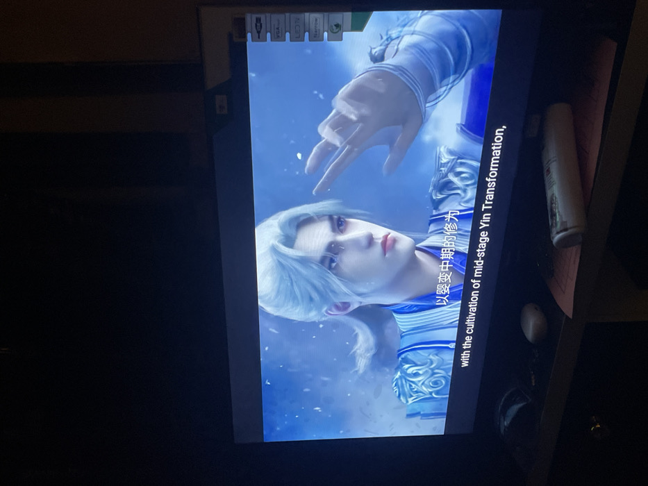 A flat-screen television, positioned in a dimly lit room in Unknown, Unknown, displays an East Asian-style animated male character. The character has light blue hair, a solemn expression, and wears blue and white ornate attire. His right hand is raised, fingers slightly curled, against a hazy light blue background with floating white particles. Yellow Chinese subtitles are visible above white English subtitles that read: "with the cultivation of mid-stage Yin Transformation,". On the right bezel of the television, labels like "VGA," "HDMI," "LED TV," and "Narrow" are vertically oriented. Directly below the television, on a dark surface, are a black computer mouse to the left, a small, light-colored irregular object centrally, and a horizontal white cylindrical bottle resting on a pinkish piece of paper to the right. The surrounding area is dark and indistinct, with the television screen being the primary light source.