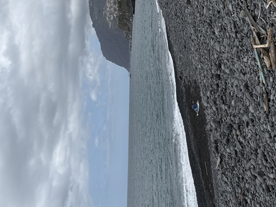 The image displays a coastal scene in Funchal, Portugal, characterized by an overcast sky. The foreground is dominated by a dark pebble beach, interspersed with larger, smooth grey stones. At the bottom right, a collection of driftwood and a fragment of turquoise-colored material are present. Near the waterline, slightly left of center, a single individual is seated on a light-colored mat or towel. The person is dressed in blue attire. Gentle white-capped waves break on the shore, meeting the dark grey-blue ocean. In the mid-ground, the ocean extends to the horizon. The background features a steep, dark mountainous coastline on the right, with scattered white buildings of a settlement visible on its slopes. A pier or elevated coastal structures extend over the water at the base of the cliff. The sky is largely covered by grey clouds, with some lighter blue areas visible.