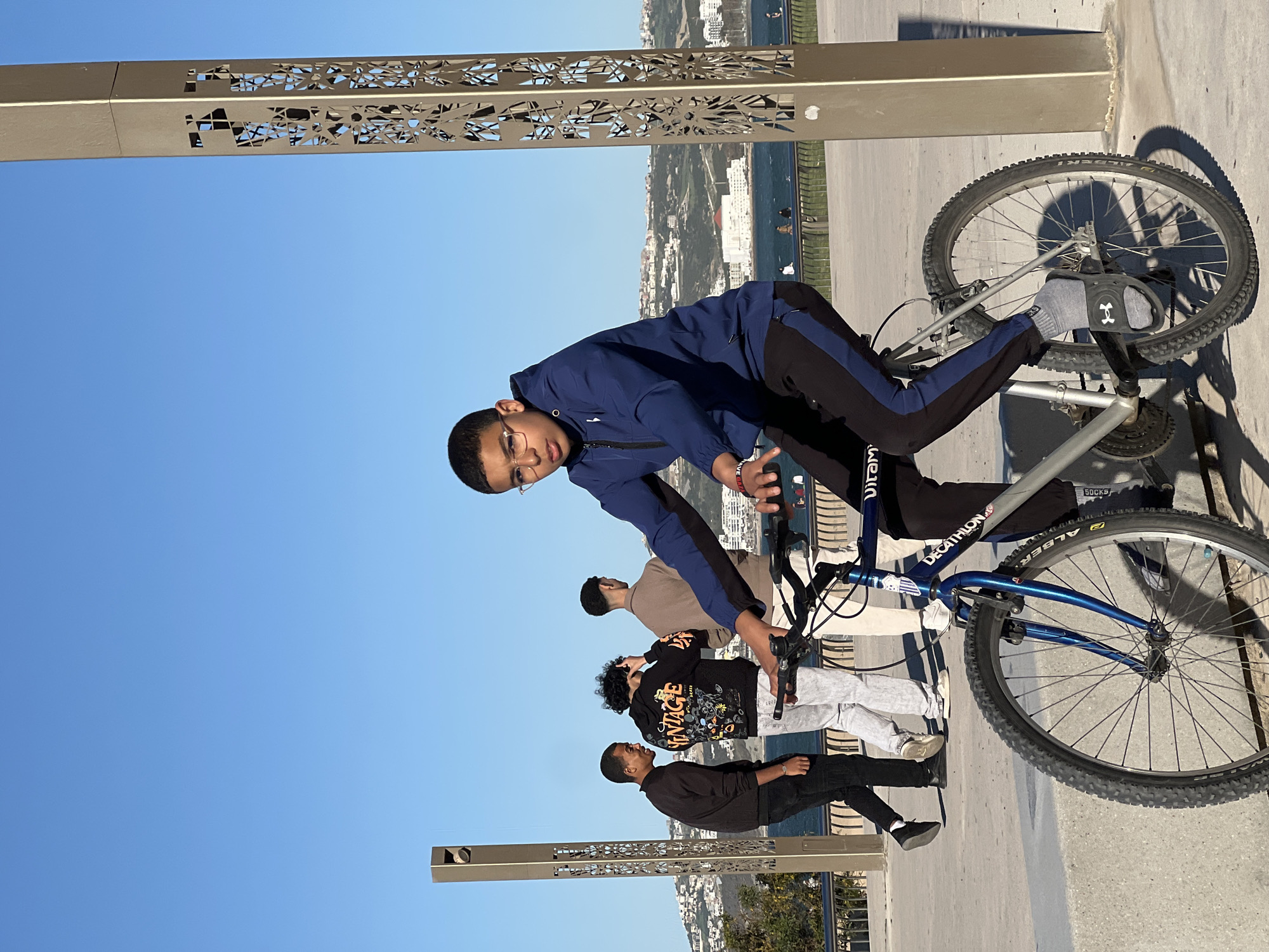A photo captures a young man on a bicycle, with three others standing in line behind him. They are located on an elevated walkway with metal railings and ornamental posts, overlooking a city landscape. The setting appears to be Tanger طنجة, Morocco, based on the urban architecture and the presence of water in the background. The sky is clear and blue. The young man on the bike is wearing glasses, a blue jacket, and black pants, with an athletic sock and sandal on his right foot. The bicycle is a silver and blue mountain bike with a "Decathlon" brand sticker on the frame. The other three individuals vary in height and attire, each facing the same direction as the cyclist. The concrete walkway features metal posts with decorative cut-out patterns. Buildings and greenery are visible in the distance.