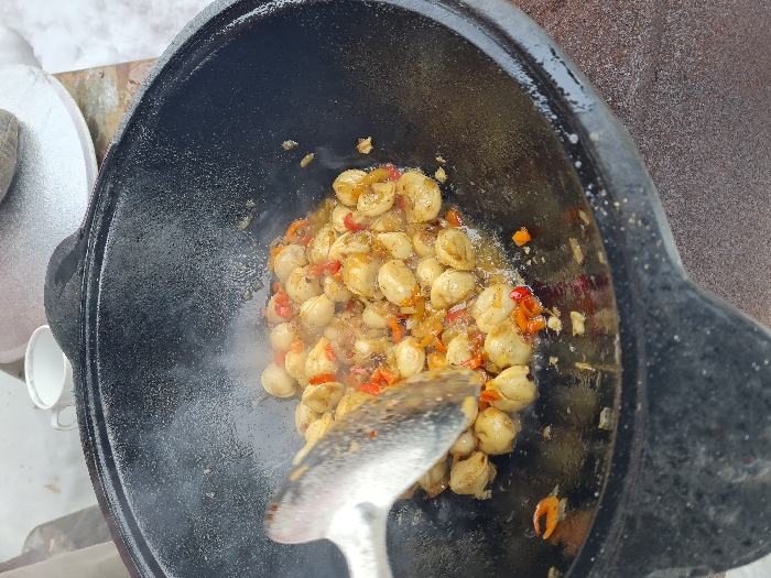 An outdoor cooking scene in Markovo, Russia, is depicted. The central focus is a large, dark, robust cooking pot, likely cast iron, containing food actively being prepared. Inside the pot, numerous light-colored, round food items are sautéing in liquid, mixed with chopped red and yellowish-brown vegetables, consistent with peppers and onions. Visible steam rises from the contents, indicating heat. A silver-colored metal spatula or ladle is partially immersed, engaged in stirring the food. In the upper left background, a white ceramic mug rests on a surface. To the upper right, a portion of a silver-colored, circular object, possibly a lid or tray, is visible. The ground or surface immediately behind the pot displays patches of white material consistent with snow, suggesting a cold, outdoor environment. The pot is situated on a dark, sturdy base, partially visible at the bottom of the frame.