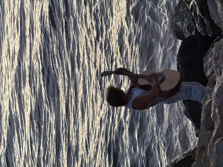 A single individual stands on large, dark rocks at the edge of the Mediterranean Sea, characteristic of Tel Aviv's coastline or a breakwater. The person, an adult with medium-length, light-colored hair, is viewed from the side, partially silhouetted against the water. They are wearing a white tank top, light-colored long trousers, and multiple necklaces. The individual holds an acoustic guitar, its light wood body visible, with both hands positioned on the instrument as if prepared to play or carry it. Their head is turned towards the undulating water, which reflects a soft, low-angle light, indicating either sunrise or sunset. The immediate environment consists of dark, irregular rock formations in the foreground and midground, leading directly to the open sea with visible waves.