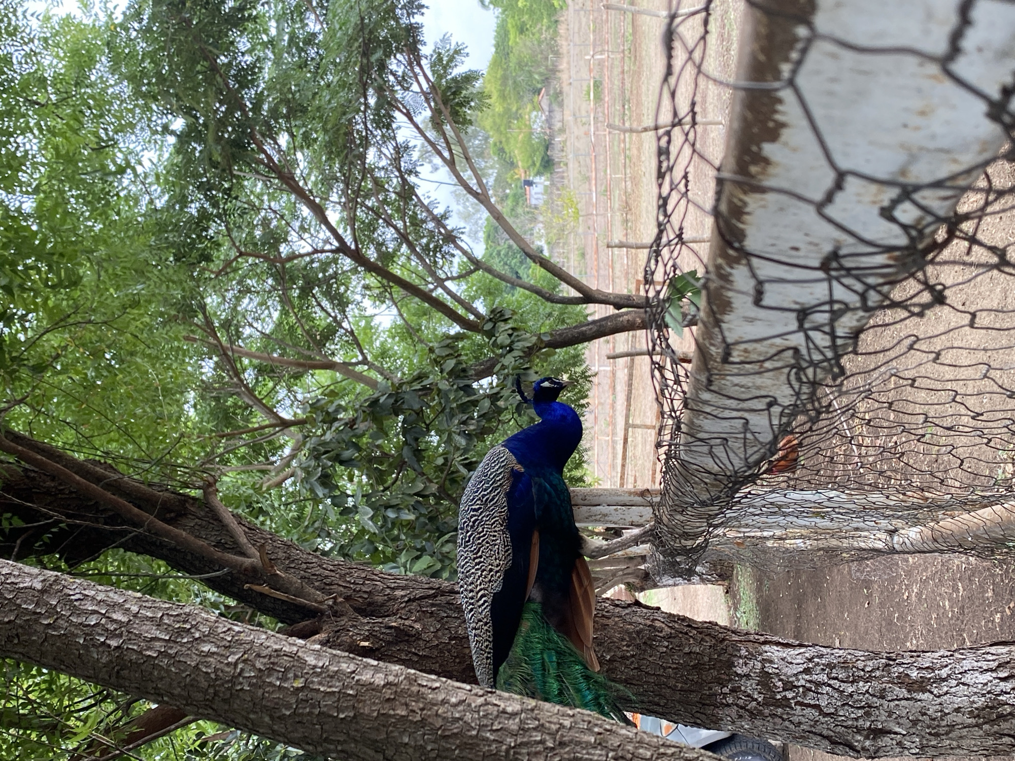 A peacock is perched on a tree branch next to a fence in Tinaquillo, Venezuela