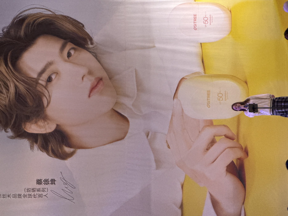 The scene depicts an indoor event in Changping District, China, centered around a large promotional backdrop. The backdrop features a prominent image of male celebrity Cai Xukun (蔡徐坤) from the chest up, with light brown and blond hair, wearing a white collared shirt, looking directly forward. Chinese characters on the upper left identify him as the global spokesperson for a brand's sunscreen series. His hands are visible at the bottom of his image, near two product containers. These products, labeled "OSITREE" with "SPF 50 PA++", are light yellow ("REPAIRING SUNSCREEN") and light orange/pink ("WHITENING SUNSCREEN"). The backdrop's lower section is bright yellow, transitioning to a light pink/white gradient at the top. In the foreground, positioned centrally against the backdrop, a young female stands at a microphone on a stand. She wears a white long-sleeved top and a dark plaid skirt, and her mouth is open, indicating she is speaking or singing. The tops of several heads are visible at the very bottom edge of the frame, suggesting an audience.