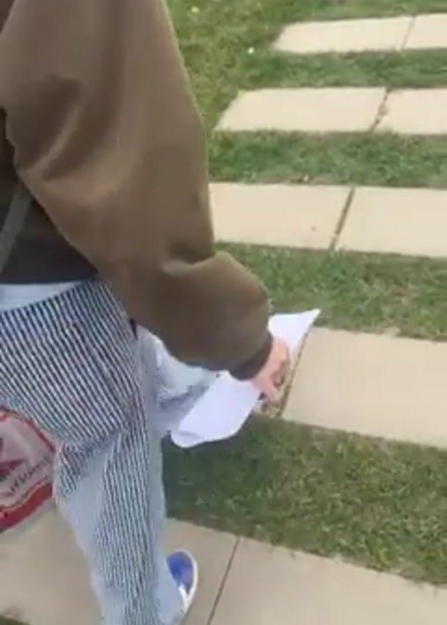 A person walks on a stone path set in grass. The person is wearing blue and white striped pants, a brown hoodie, and blue sneakers. They are carrying a backpack and a red shopping bag, and are holding a piece of white paper. The path is made of rectangular stones. The background includes a street with cars and buildings.