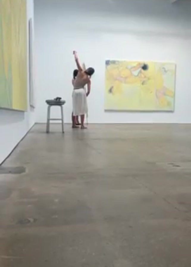A woman stands in an art gallery stretching her arm up in the air. She wears a tank top and a white skirt. There is a man in front of her. To her left is a stool with objects on top of it and an unframed painting on the wall. The wall directly in front of her displays a large triptych painting. The floors are bare concrete.