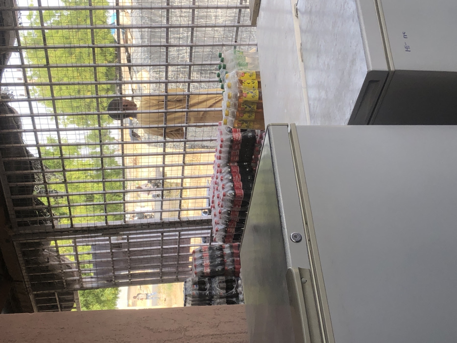 An outdoor shop is seen through a wire fence. A man is standing outside. The foreground shows two white refrigerators. Stacked drinks, primarily Coca-Cola, are placed on top of the refrigerators, extending towards the wire fence. The scene is lit by daylight.