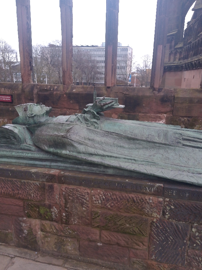 The image depicts a recumbent bronze effigy of an ecclesiastical figure, likely a bishop, positioned within the exposed ruins of St Michael's Cathedral in Coventry, United Kingdom