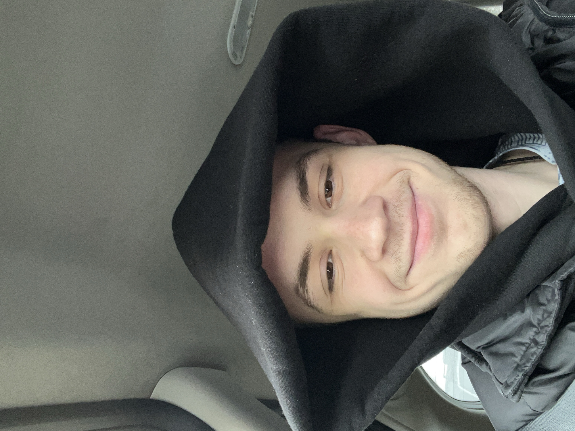 The image displays an adult male, visible from the chest up, seated in the interior of a vehicle in the city of Unknown, Unknown. The subject has light skin, brown eyes, and light brown facial stubble, with a slight, closed-mouth smile directed at the camera. He is wearing a black hooded sweatshirt with the hood drawn over his head, a black puffer-style jacket worn over the hoodie, and a light-colored collared shirt visible at his neck. A dark cord or necklace is present on his chest. A grey seatbelt strap is visible over his left shoulder. The vehicle's interior includes a light grey ceiling, a partially visible overhead light fixture or vent in the upper right, and a blurry view through a window in the background showing faint horizontal lines.