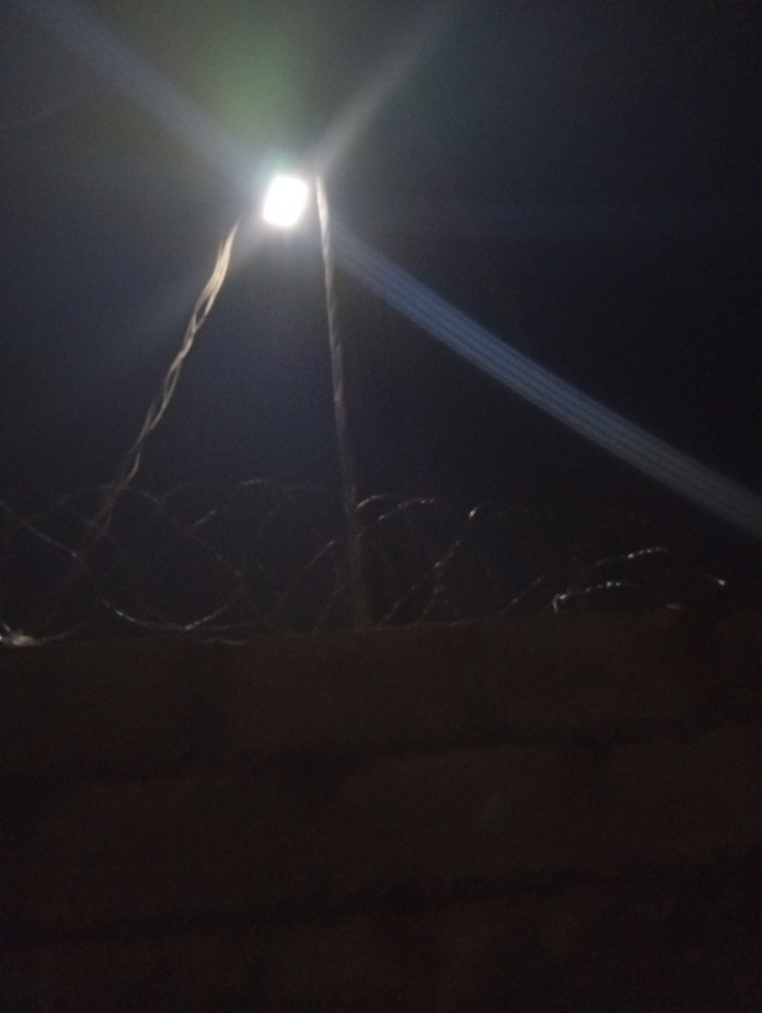 A stark nighttime scene features a bright street light atop a pole. Beneath the light, a dark wall is topped with barbed wire, silhouetted against the night sky. The light casts strong beams, illuminating the surrounding darkness and highlighting the security barrier. The scene evokes a sense of confinement and caution.