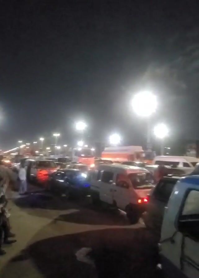 busy street at night with heavy traffic. Cars, vans, and trucks are lined up bumper to bumper under bright streetlights. Some people are standing or sitting on the sidewalk, seemingly waiting. The overall environment suggests a congested urban area during nighttime.
