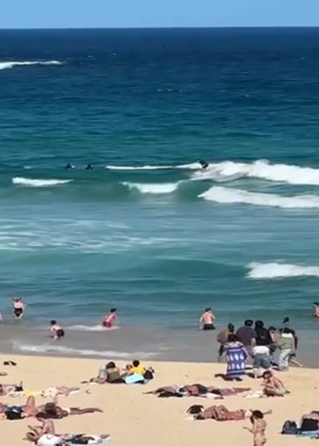 beach scene on a sunny day. The ocean is a deep blue color with white-capped waves. Several surfers are riding the waves further out in the water. Closer to the shore, people are swimming and wading in the water. On the sandy beach, a crowd of people are either standing, walking, or lying down sunbathing. The sky is a clear, bright blue. In the distance, a rocky outcrop can be seen on the left side of the frame. The overall scene depicts a busy day at the beach with people enjoying various activities.