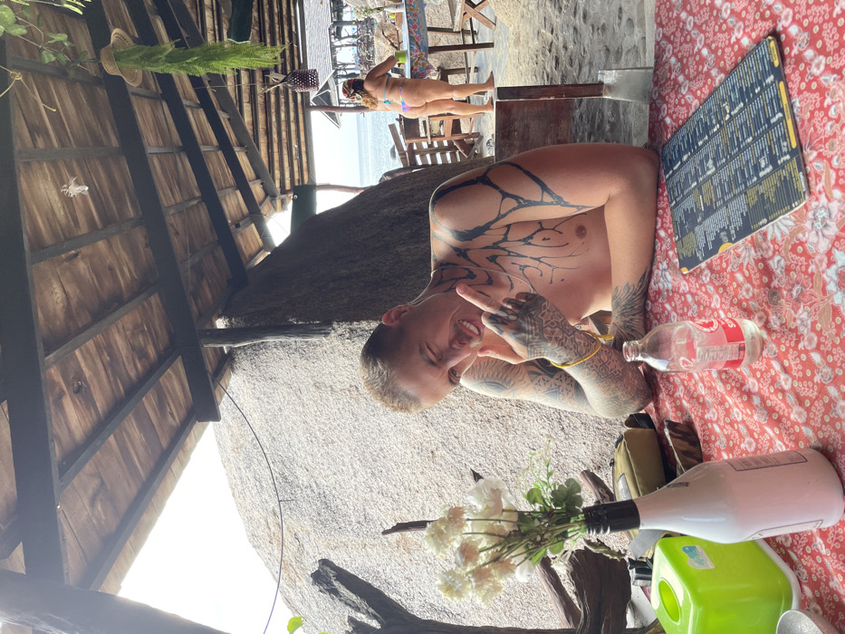 An outdoor dining area, likely a restaurant or bar, is depicted in Tambon Ko Tao, Thailand, situated adjacent to a large natural rock formation and overlooking the ocean. The scene is illuminated by natural light under a bright sky, with a wooden roof structure providing shade. In the foreground, a shirtless male with light skin, short brown hair, and extensive black tribal-style tattoos on his arms, chest, and shoulder is seated at a table. He wears a gold chain and a yellow bracelet on his left wrist. He is winking with his left eye and making a "rock on" gesture with his right hand, directed towards the viewer. The table is covered with a red and white floral tablecloth. Objects on the table include a partially visible silver bowl, a light green plastic tissue box cover, a white bottle containing white artificial flowers, a brown tactical-style pouch, a clear glass bottle with an inverted red label (Coca-Cola), and an open black menu with yellow accents. In the midground, a large, textured grey rock face dominates the left side. To the right, under a similar wooden roof structure, a woman stands with her back to the camera, facing a wooden table. She is wearing a light blue bikini top and a bright pink thong-style bikini bottom. Her head is partially covered by a dark headwrap or hat, and she appears to be interacting with items on the table, which includes a green container. Wooden chairs and tables are visible near her. The background reveals the calm, blue ocean under a hazy horizon, suggesting a coastal setting. The ground beneath the structures appears to be light-colored sand or dirt. Decorative elements hanging from the wooden roof beams include a straw hat with green foliage and a small woven basket.