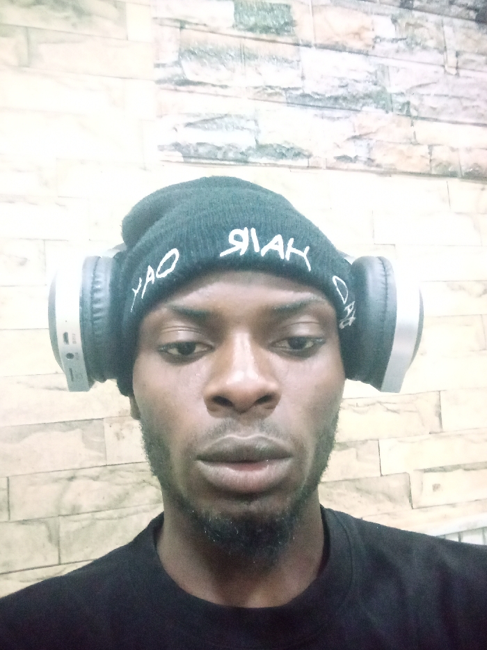 A man with dark skin and a short beard stares directly at the camera. He wears a black beanie with the word "HAIR DAY" in white letters. Large, over-ear headphones with gray padding cover his ears. He is wearing a plain black t-shirt. The background is a light-colored wall with a textured, stone-like pattern. The lighting appears to be somewhat dim and uniform.