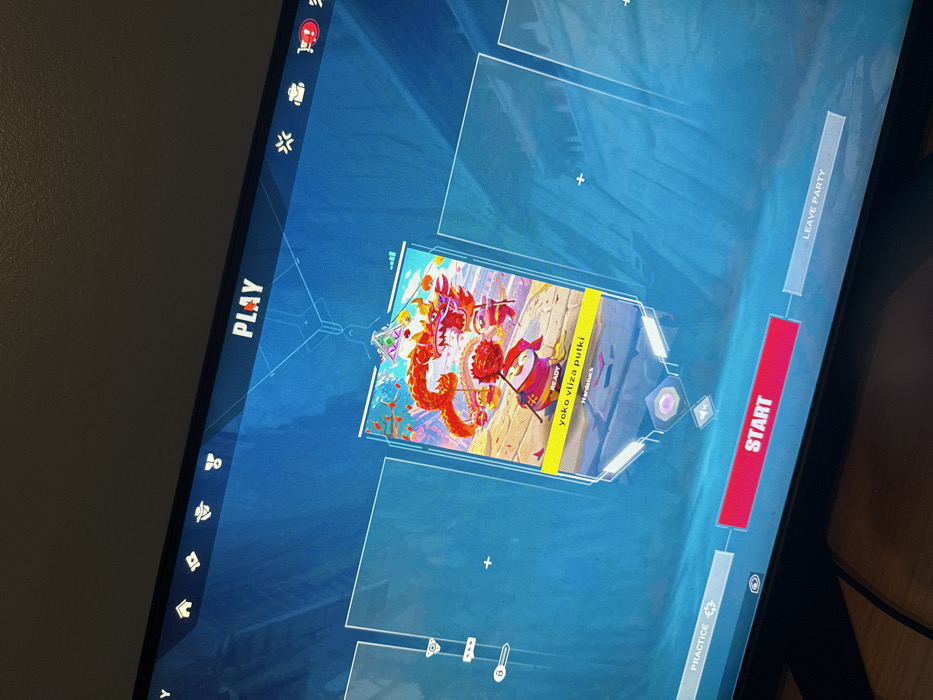 The image displays a digital screen showing a video game interface, captured from a low angle within a dimly lit indoor environment in Leicester, United Kingdom. The screen exhibits a predominantly blue interface with white angular design elements and the word "PLAY" at the top center. A central player card features a vibrant illustration of a red, serpentine dragon creature and a small, white, round character wearing a red hat, set against a festive background with Asian-inspired architecture and lanterns. Text elements "READY," "yoko vliza putki," and "Hardsfuck" are visible on this card. The top navigation bar includes icons such as home, a hat, a trophy, a gear, a shopping cart, and a warning symbol. At the bottom of the screen, a prominent red "START" button is centered, flanked by a "PRACTICE" button to the left and a greyed-out "LEAVE PARTY" button to the right. Empty player slots, marked with plus signs, are visible on either side of the central player card. The area directly below the screen is a dark, flat surface.