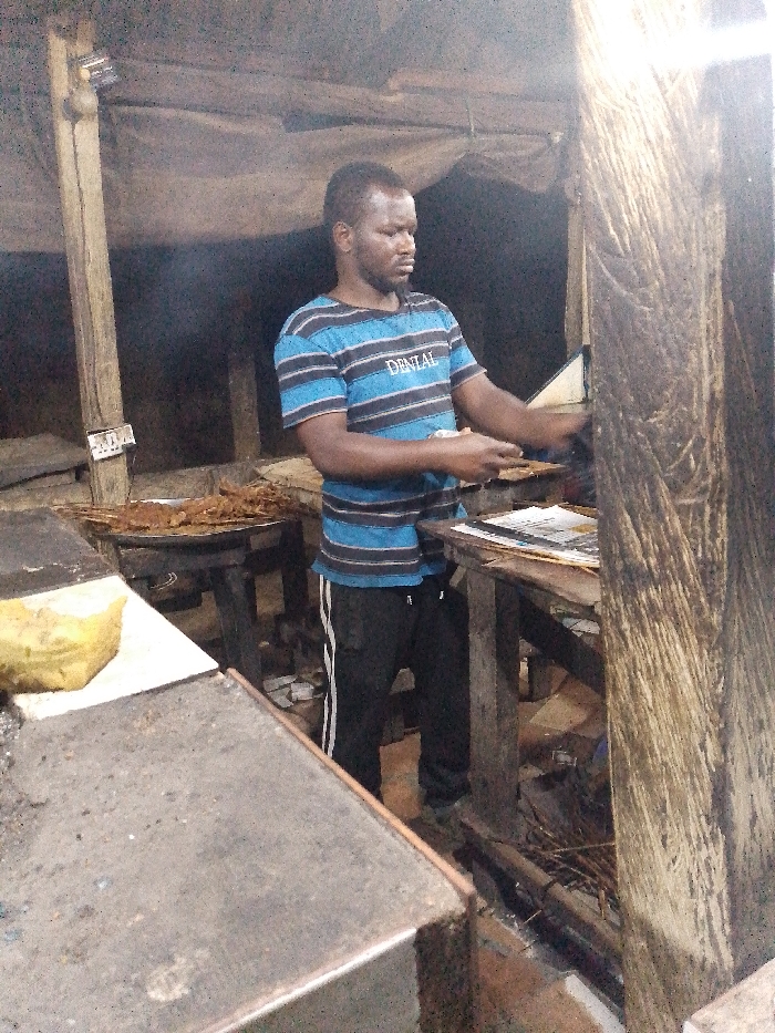 A man in a blue and black striped shirt and black pants stands behind a makeshift food stall. He appears to be working with food items, possibly preparing or serving them. A tray of grilled food skewers sits on a table to his left. The stall is constructed with rustic wooden supports, and an overhead covering is visible. The overall lighting suggests an outdoor or dimly lit setting. The scene conveys a sense of local food preparation and service.