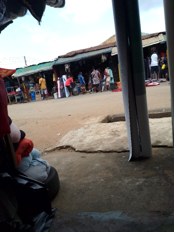 The image depicts an outdoor market scene in an unidentified city of Unknown, Unknown, viewed from a slightly elevated, partially obstructed perspective