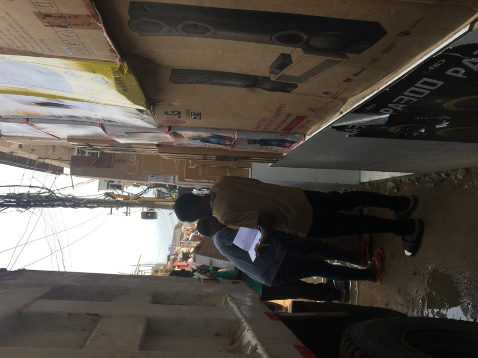 The image displays a bustling, narrow commercial passageway in Ojo, Nigeria, under an overcast sky