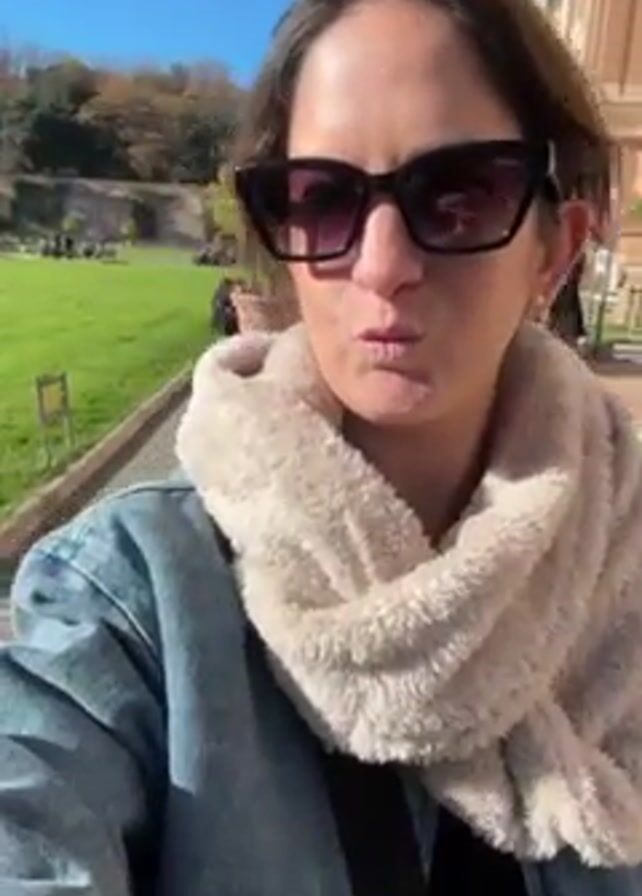 woman in sunglasses, a denim jacket, and a beige scarf taking a selfie. She's standing outside, likely in a tourist area, with a large building and green spaces in the background. People are walking around. The day appears sunny. The woman makes different faces at the camera.
