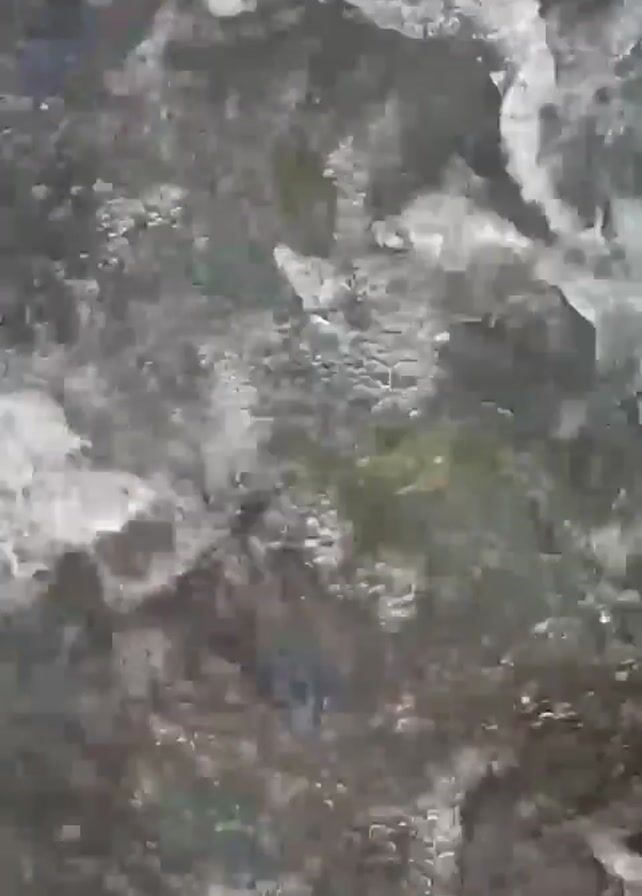 The camera is held close to the water's surface. The water is shallow and clear, with rocks and pebbles visible beneath the surface. The water is rippling and moving. The video is likely taken outdoors, as there are no visible signs of an indoor setting. A voice is heard speaking in the background.