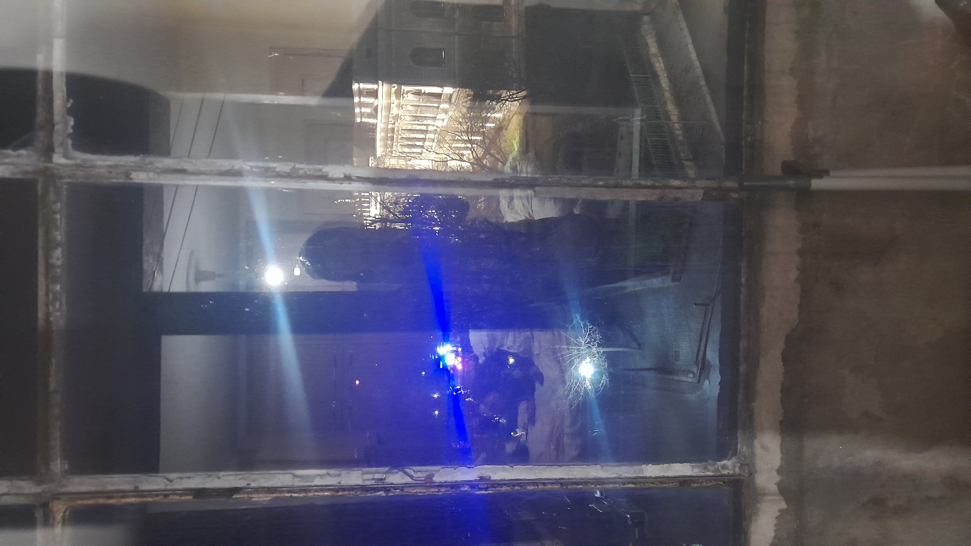 The image captures a nighttime urban scene in Svishtov, Bulgaria, viewed through an aged, multi-pane window with a weathered wooden frame. Reflections on the glass include a partial human silhouette and an interior light fixture. Exterior details visible through the window panes depict: On the left, an emergency vehicle with active flashing blue and red lights is present on a street or public square. Scattered ambient lights are visible in the vicinity. A bare deciduous tree in the lower-center is illuminated from its base. On the right, a large, ornately designed classical building, consistent with a public institution such as the Cultural Center 'Grigor Parlichev' or the Municipality building in Svishtov, is brightly illuminated, highlighting its architectural features and columns. Another less illuminated building is partially visible to the right of the main structure. Bare trees are situated between the viewer's position and the illuminated building. A paved area and a metal railing are visible in the lower-right foreground of the exterior. Ground surfaces show indications of moisture or a light layer of snow/ice. The entire exterior scene is lit by various artificial urban light sources.