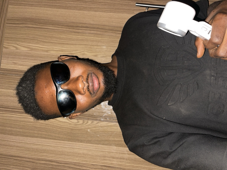 A male individual with dark skin, short textured dark hair, a beard, and a mustache is depicted in a portrait-oriented image. He wears black sunglasses with dark lenses and a black frame. His attire consists of a black long-sleeved shirt or sweatshirt, which features a faint, embossed or debossed graphic design on the chest area. In his right hand, he holds a white and gray handheld device, consistent with a lint remover or similar small electronic appliance, which has a button visible on its handle. The subject is positioned directly facing the camera against a background of vertical light brown wooden paneling. The scene is located in the city of Muchiya, Nigeria.