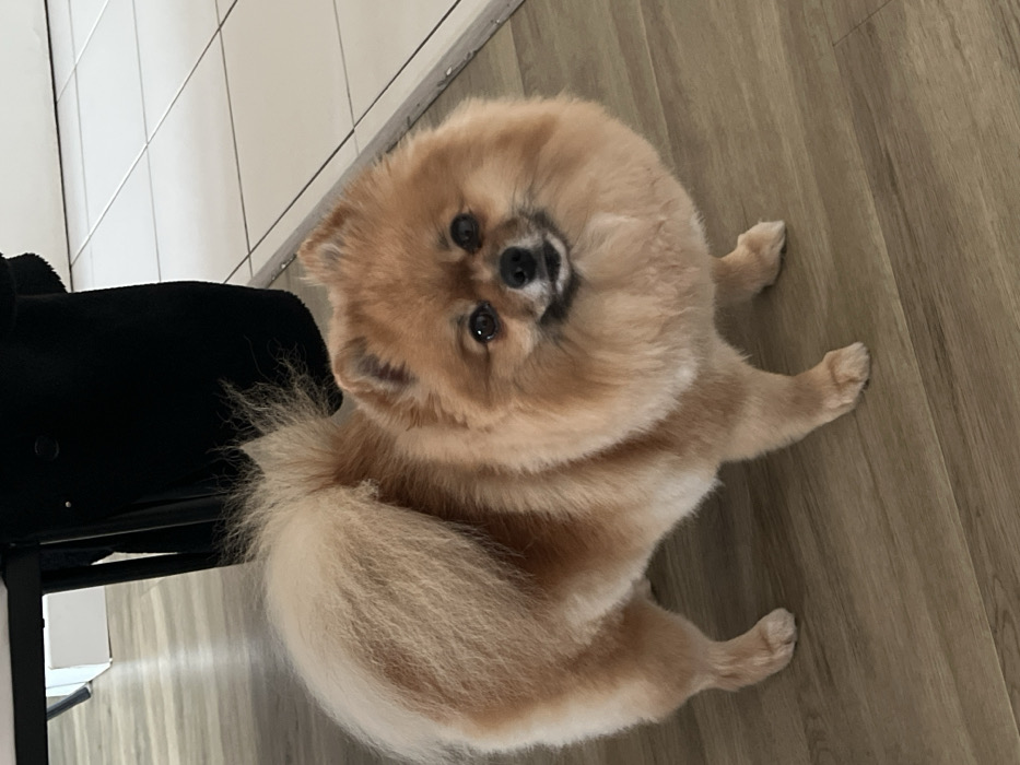 - "A fluffy, light brown Pomeranian dog is sitting on a wood-look floor next to a black chair" by FM-vTiXm2, licensed under CC BY 4.0