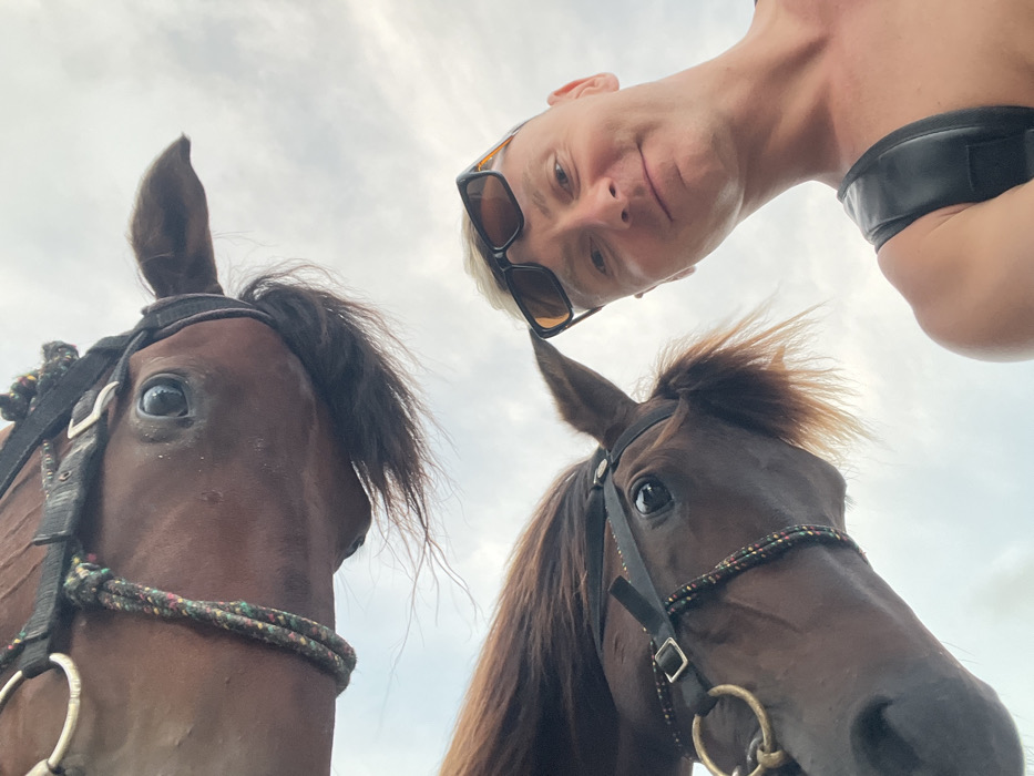 - "A low-angle selfie captured in Jimbaran, Indonesia, depicts a fair-skinned male individual alongside two brown horses, set against an overcast sky" by FM-xgQP92, licensed under CC BY 4.0