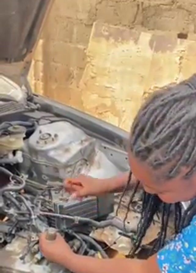 A woman with long braids wearing a blue floral shirt is working on the engine of a car. The car's hood is open and the engine is partially dismantled. The engine bay is dirty and shows signs of rust and wear. The woman is using a tool, potentially pliers or wire cutters, to manipulate wires or components within the engine. She is focused on her task and appears to be applying force. The setting seems to be an outdoor repair environment, possibly a backyard or small workshop, with a concrete or brick wall in the background.