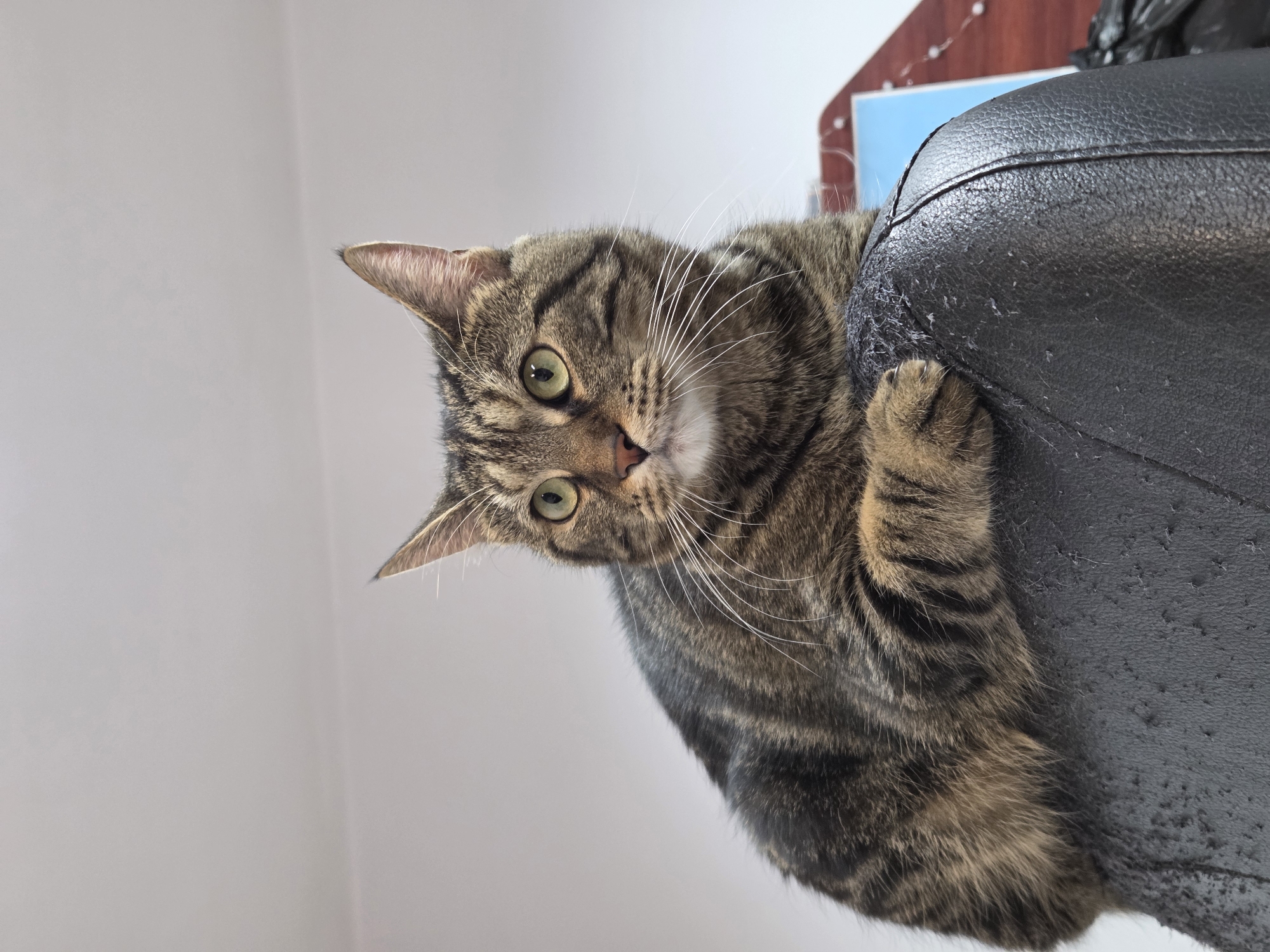 A brown mackerel tabby cat is observed resting atop a severely damaged black upholstered surface, identified as the backrest of a piece of furniture. The cat, with prominent dark stripes on a lighter brown background, green eyes, a pink nose, and white whiskers, is oriented to the left, with its head turned to the right, looking slightly upwards. Its front paws are tucked beneath its body. The black upholstery shows extensive abrasions and tears, indicative of consistent scratching. The immediate background is a plain, light-colored wall or ceiling. In the lower right portion of the image, out-of-focus elements include a brown surface, a partial blue object, and indistinct dark items. This scene is located in Burgas, Bulgaria.