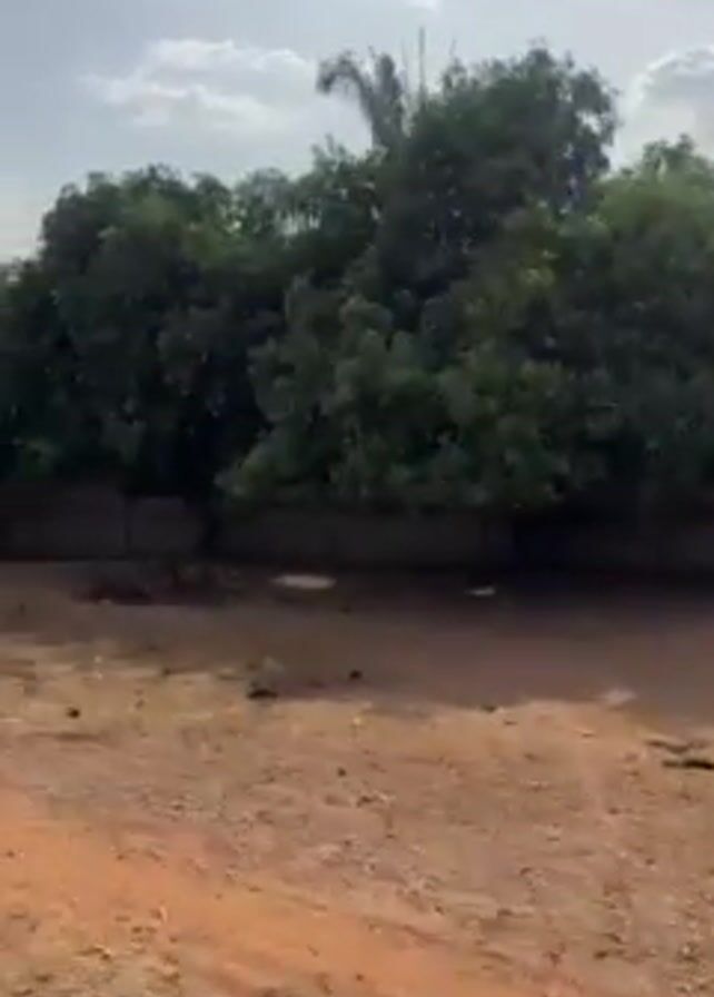 The video depicts a roadside view from a moving vehicle, potentially a car. The road surface is dirt, with sparse vegetation and debris scattered around. Initially, the view includes trees, a concrete wall, and a partially visible gate. A sign reading "Welcome to Keffi, NASARAWA STATE UNIVERSITY, KEFFI" appears briefly. The camera pans further along the road, showcasing more trees and sections of the concrete wall bordering what appears to be a property. The weather appears sunny, with a partly cloudy sky visible above the trees and structures. The footage is shot from inside a vehicle. The video ends with a view along the wall and trees.