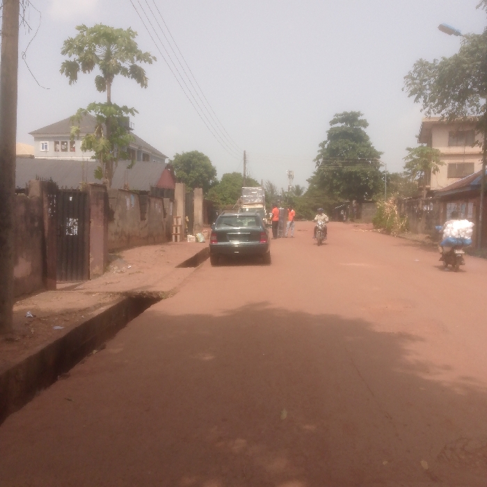 The image depicts a street scene in the city of Abakaliki, Nigeria, characterized by an unpaved, reddish-brown laterite road under an overcast or hazy sky. **Environment:** The road surface is uneven, showing minor depressions and undulations. An open concrete drainage ditch runs along the left side of the road, separating it from a raised unpaved shoulder. On the left, a low, partially rendered concrete wall with a dark metal gate encloses a property. Behind this wall, a two-story building with a light-colored exterior and multiple windows is visible, partially obscured by a tall, slender papaya tree. A utility pole with overhead power lines stands prominently on the far left. On the right side of the road, additional buildings and dense vegetation are present further in the distance, including another two-story building and a street light fixture mounted on a pole. **Objects and Subjects:** * **Vehicles:** A dark-colored sedan, possibly black or dark green, is parked on the left side of the road, facing away from the viewer. Its trunk appears elevated or open. Further down the road, a motorcycle is being ridden by an individual towards the viewer. On the far right, another motorcycle, heavily laden with white sacks (likely goods), is also moving towards the viewer. * **People:** A cluster of approximately 3-4 individuals, some wearing orange shirts, are gathered near the rear of the parked sedan, appearing to be engaged in an activity involving the vehicle's open trunk. A single individual is operating the motorcycle in the mid-ground. Another individual is operating the heavily laden motorcycle in the background. **Actions and Interactions:** Individuals near the parked sedan appear to be loading or unloading items from the vehicle. Two distinct motorcycles are in motion on the road, traveling in the direction of the camera. No direct interaction between the pedestrians and motorcyclists is evident.