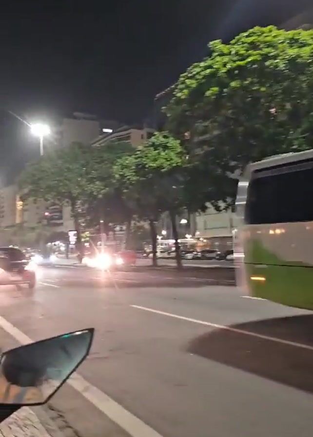 street at night. A bus passes by, followed by several cars. There are trees along the street and buildings in the background. Streetlights are visible, and a traffic light turns red. The camera appears to be positioned on the side of the road, possibly attached to a vehicle.