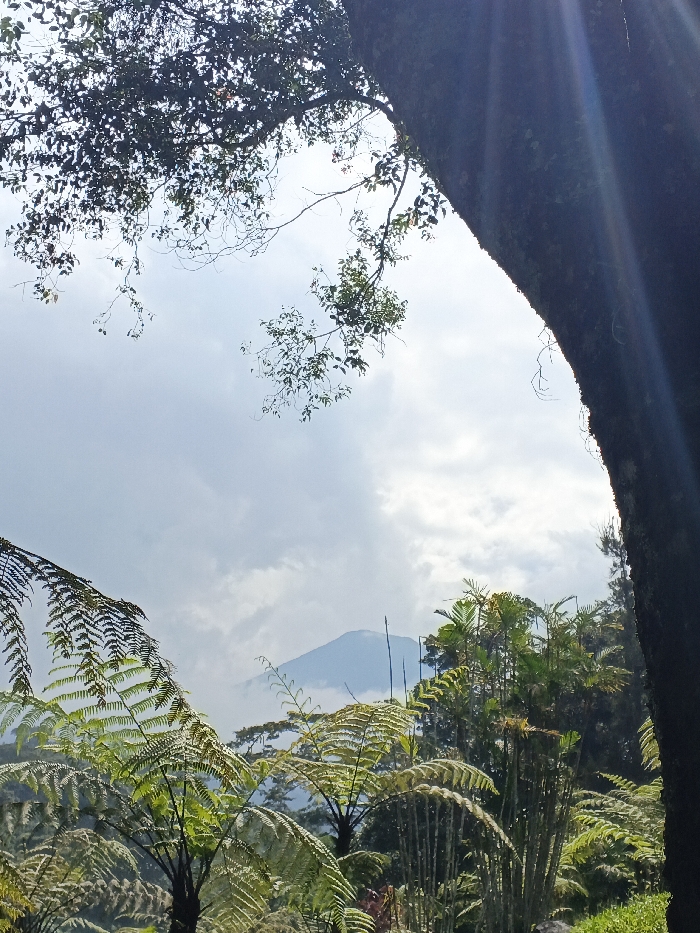 A landscape view featuring lush greenery with fern-like plants in the foreground. A tall tree trunk with sunlight streams is on the right. Above the verdant foliage, a mountain peak is visible in the distance, shrouded in mist or clouds. Branches and leaves from an overhanging tree frame the top of the image against a cloudy sky. The scene suggests a forest environment or mountainous region.