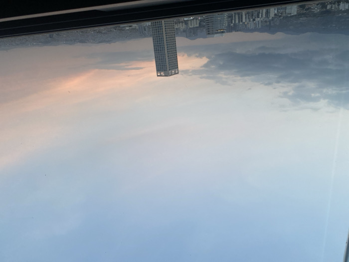 A tall, rectangular skyscraper dominates the upside-down cityscape. Other buildings are visible in the distance, nestled against a mountain range. Cloudy skies display shades of gray, with a hint of pink near the horizon. The lower portion of the image is filled with pale blue sky, suggesting a late afternoon or early morning setting. The view appears to be framed by a window.