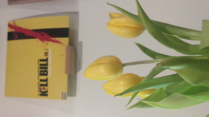 The image depicts an indoor scene with a bouquet of yellow tulips in the foreground and a "Kill Bill Vol