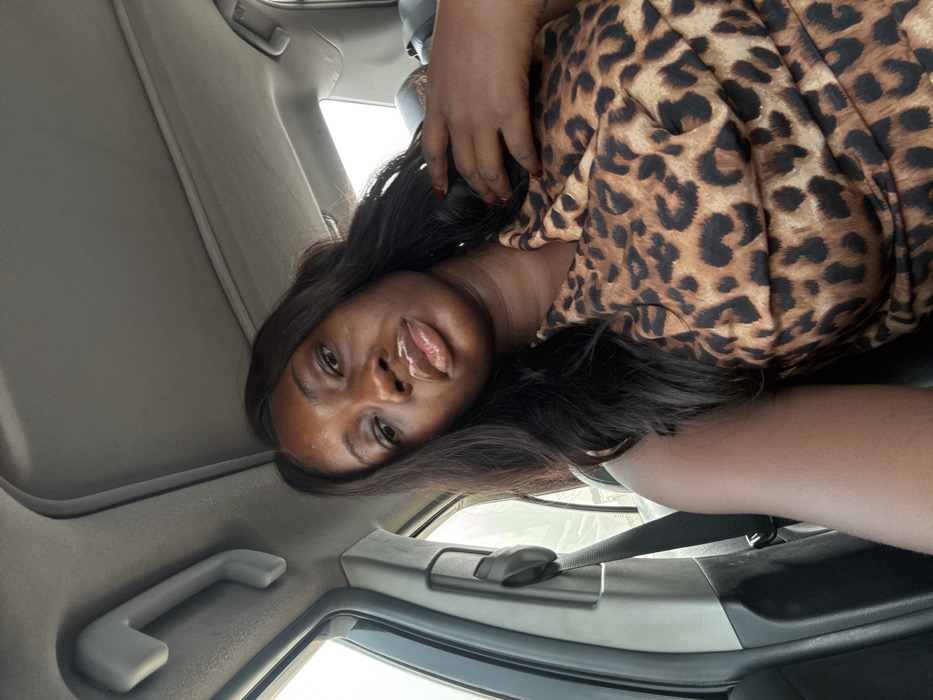The image depicts an adult female inside the front passenger compartment of a vehicle