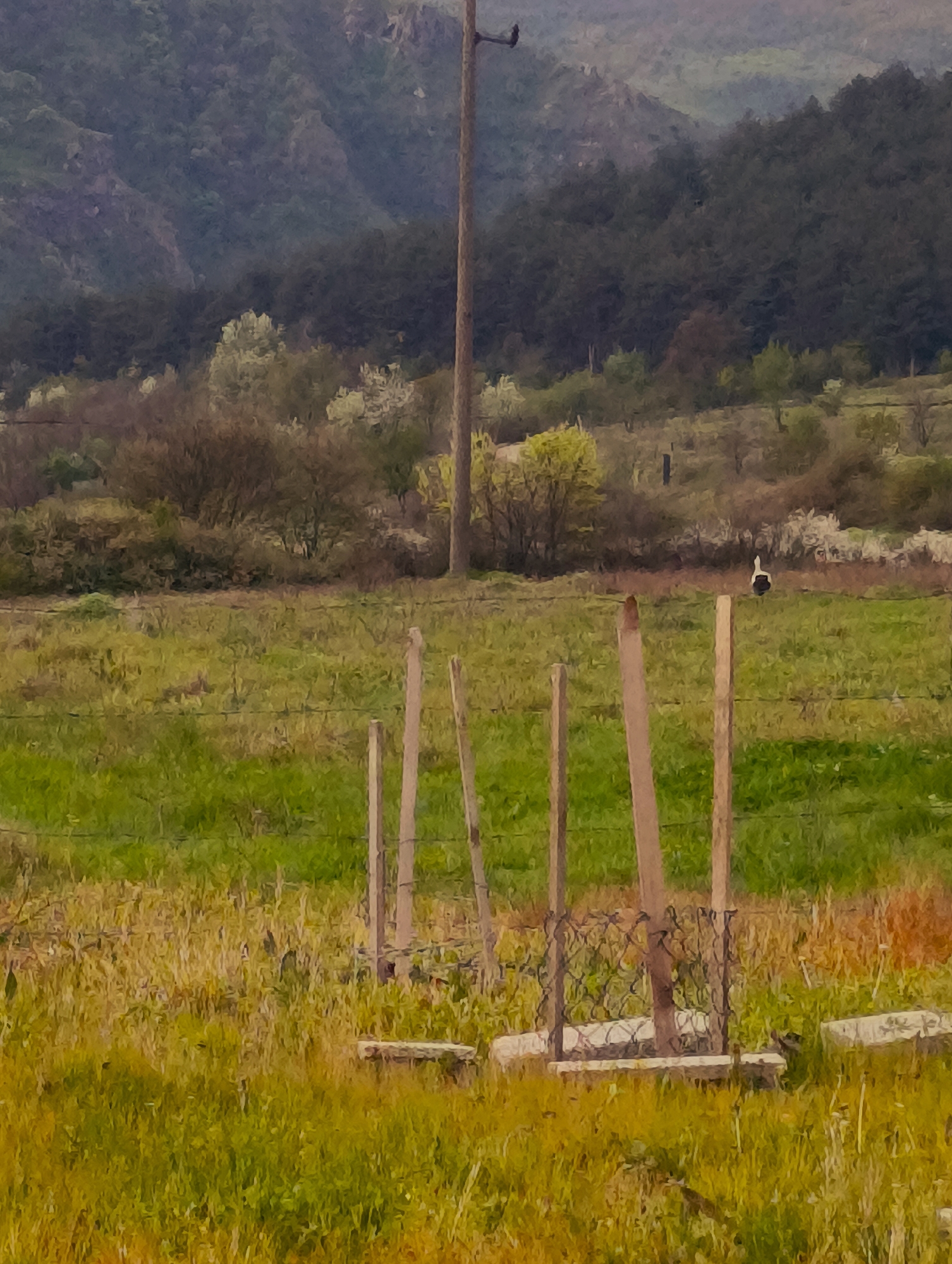 The image depicts a rural scene near Shiroko pole, Bulgaria. In the foreground, there are weathered wooden posts with wire fencing. Grasses and low-lying vegetation cover the ground. In the middle ground is a green field. A stork can be seen standing in the field. Further back, there are shrubs and trees. A wooden utility pole stands tall near the center of the frame. In the background, a mountain range covered in forest creates a backdrop. The sky is overcast.
