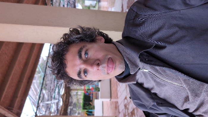 A male individual is depicted in a mid-shot, directly facing the camera, with his tongue extended. He has dark, curly hair, blue eyes, and a small metal stud piercing in his left nostril. He is wearing a dark grey collared jacket over a lighter brown/taupe zippered sweater or fleece, beneath which a dark turtleneck is visible. The scene is an outdoor or semi-outdoor area, characterized by an overhead wooden trellis structure and a light-colored structural column to the subject's right. The background features a wet, paved surface, indicative of recent precipitation, multiple white rectangular planters containing green vegetation, and indistinct colorful structures in the distance, possibly playground equipment. The specific location within Budva, Montenegro, is not discernible from the visual evidence.