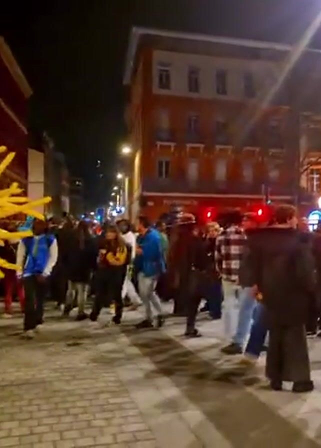crowd of people walking in a European city at night. The buildings have a classic European style, and a pharmacy sign is visible. The crowd appears to be diverse, and some people are wearing costumes or carrying novelty items. One person is carrying a large bouquet of yellow balloons, giving a festive atmosphere to the scene. The ground is paved with cobblestones. The lighting is provided by streetlights and illuminated building signs. The overall impression is of a lively street scene at night.
