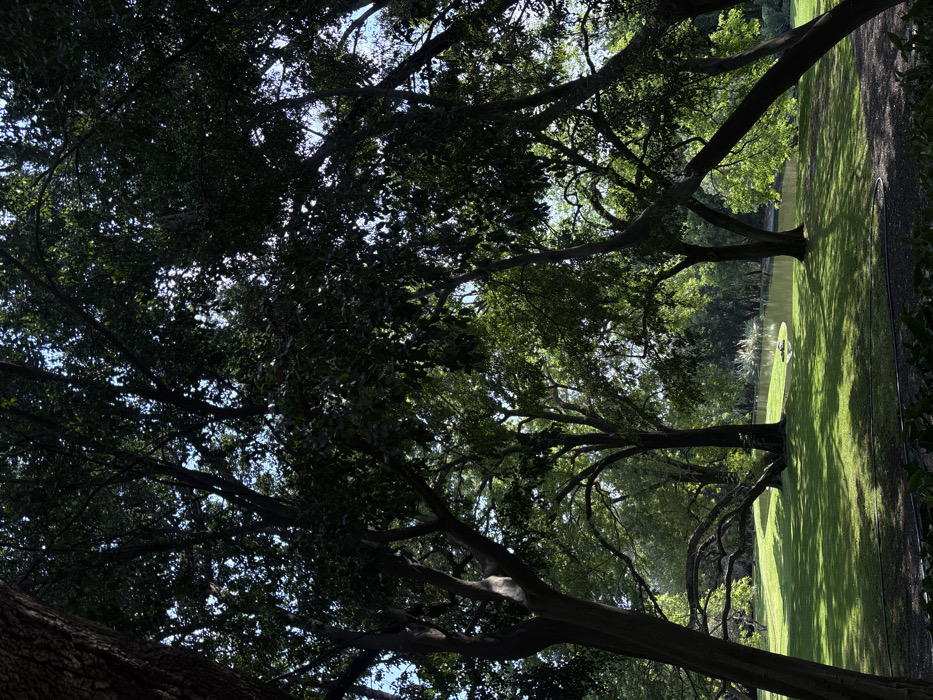 The image displays an outdoor landscape within a park or garden setting, located in Tetela Del Monte, Mexico. The foreground consists of a dark, unpaved ground or pathway, partially obscured by the bases of several large trees whose trunks and branches frame the lower and left sides of the scene. A dense overhead canopy of deciduous trees occupies the upper portion of the frame, through which patches of bright blue sky are visible. In the midground, a well-maintained green lawn is visible, exhibiting distinct areas of direct sunlight and elongated shadows cast by the surrounding trees. Scattered across this lawn are multiple mature trees with thick, prominent trunks and full canopies. Beyond the lawn, a calm body of water, consistent with a pond or small lake, stretches horizontally across the frame. The water's surface reflects ambient light and the bordering vegetation. The far bank of this water body is densely vegetated with additional trees and clusters of tall, light-colored reedy plants. No human subjects, animals, or specific man-made structures are discernible within the frame. The lighting suggests a clear day.