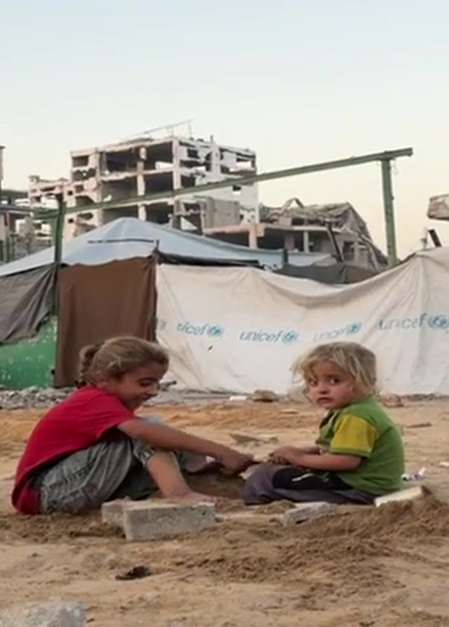 Two young children, one in a red shirt and the other in a green shirt, are sitting on the ground amidst sand and rubble. The child in the red shirt is playing with the sand, while the child in the green shirt is looking towards the camera. Behind them are makeshift shelters and a building heavily damaged from what appears to be war or conflict. The UNICEF logo is visible on the shelters in the background.