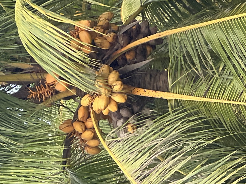 - "Several clusters of coconuts, some yellow and others dark brown, hang from a palm tree amidst its fronds" by FM-xgQP92, licensed under CC BY 4.0